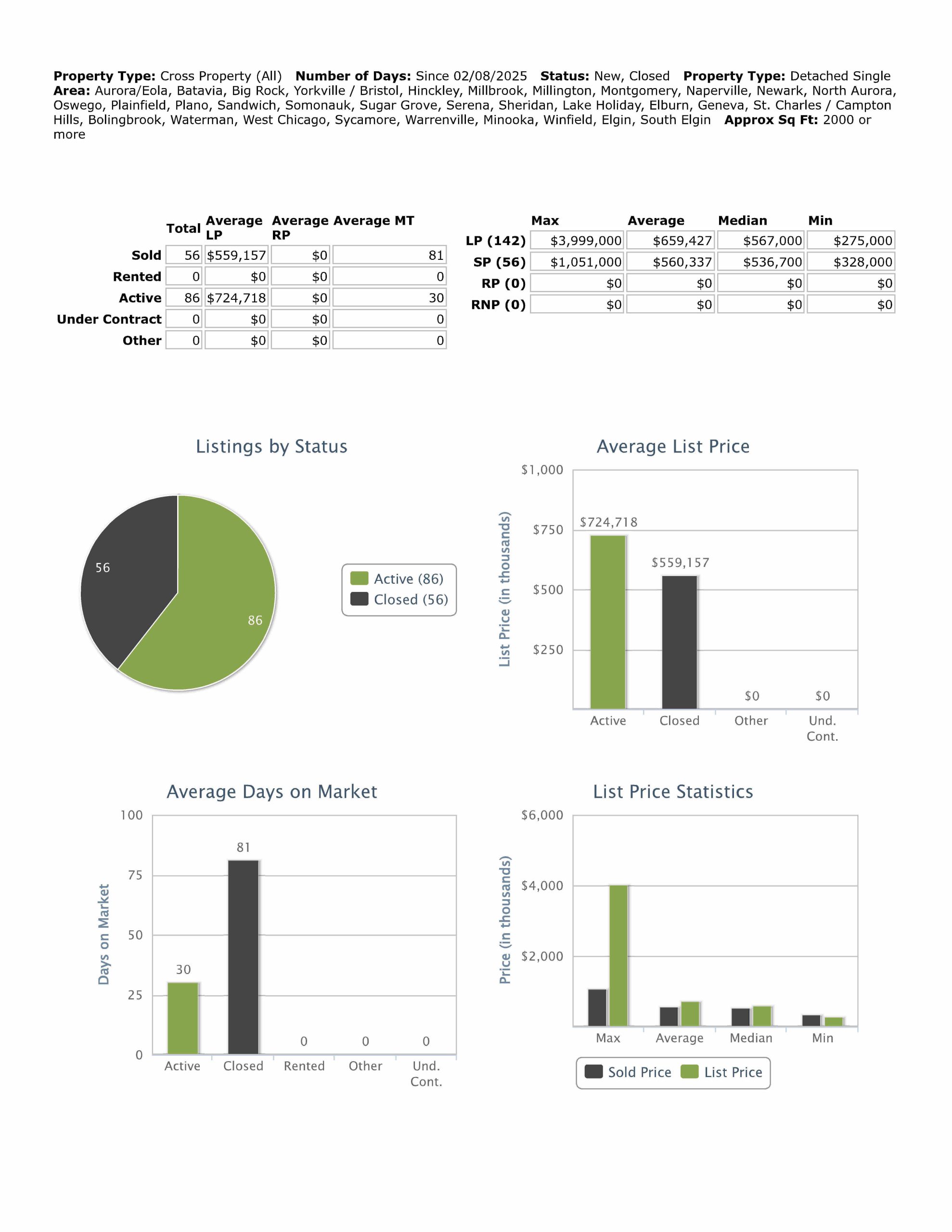 2,000 SF or more closed on 56 homes this week at median price $536,700 with 81 days average market time, last week 68 homes at median price $504,842 with 51 days average market time. Minimum price this week $328,000, last week $275,000.