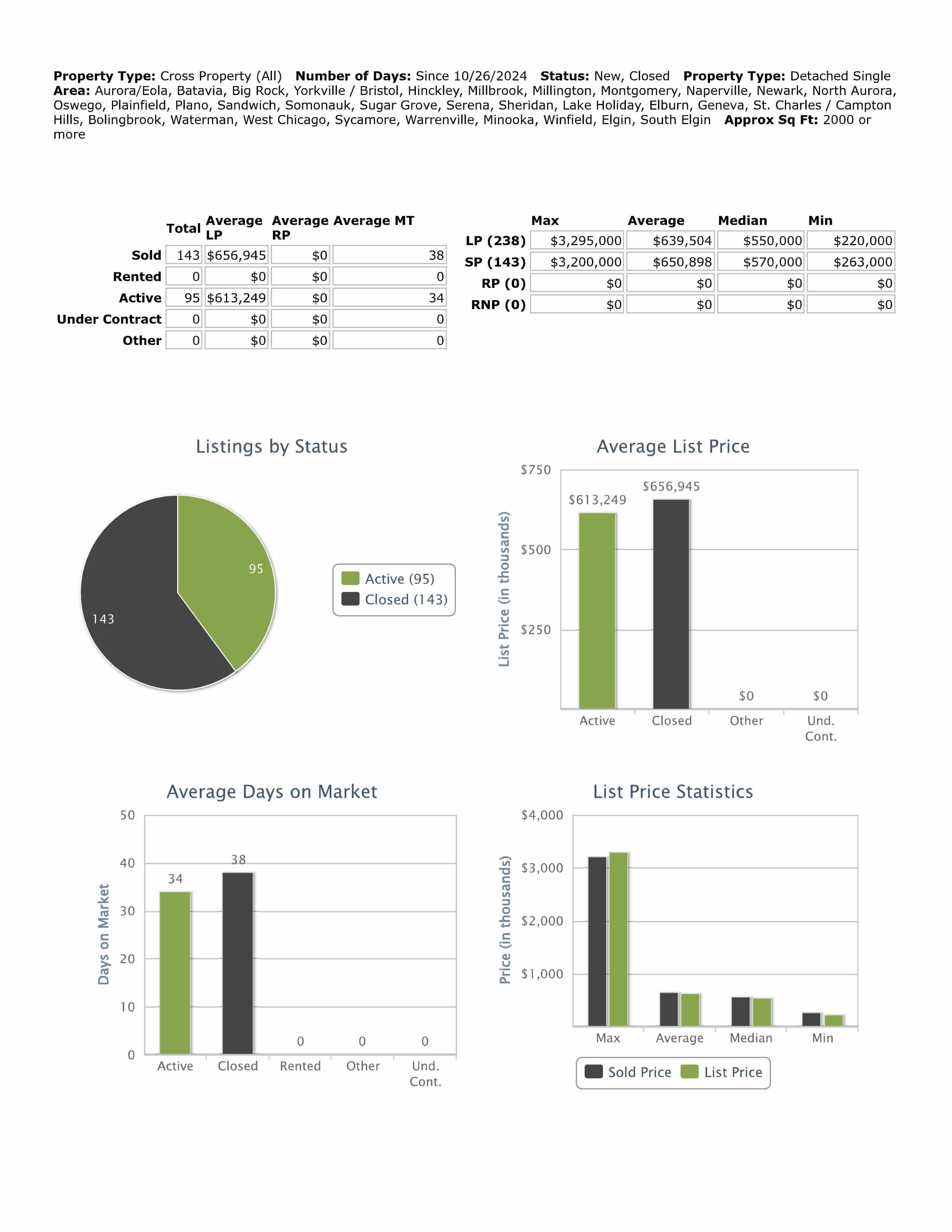2,000 SF or more closed on 143 homes this week at median price $570,000 with 38 days average market time, last week 107 homes at median price $503,000 with 36 days average market time. Minimum price this week $263,000, last week $193,000.