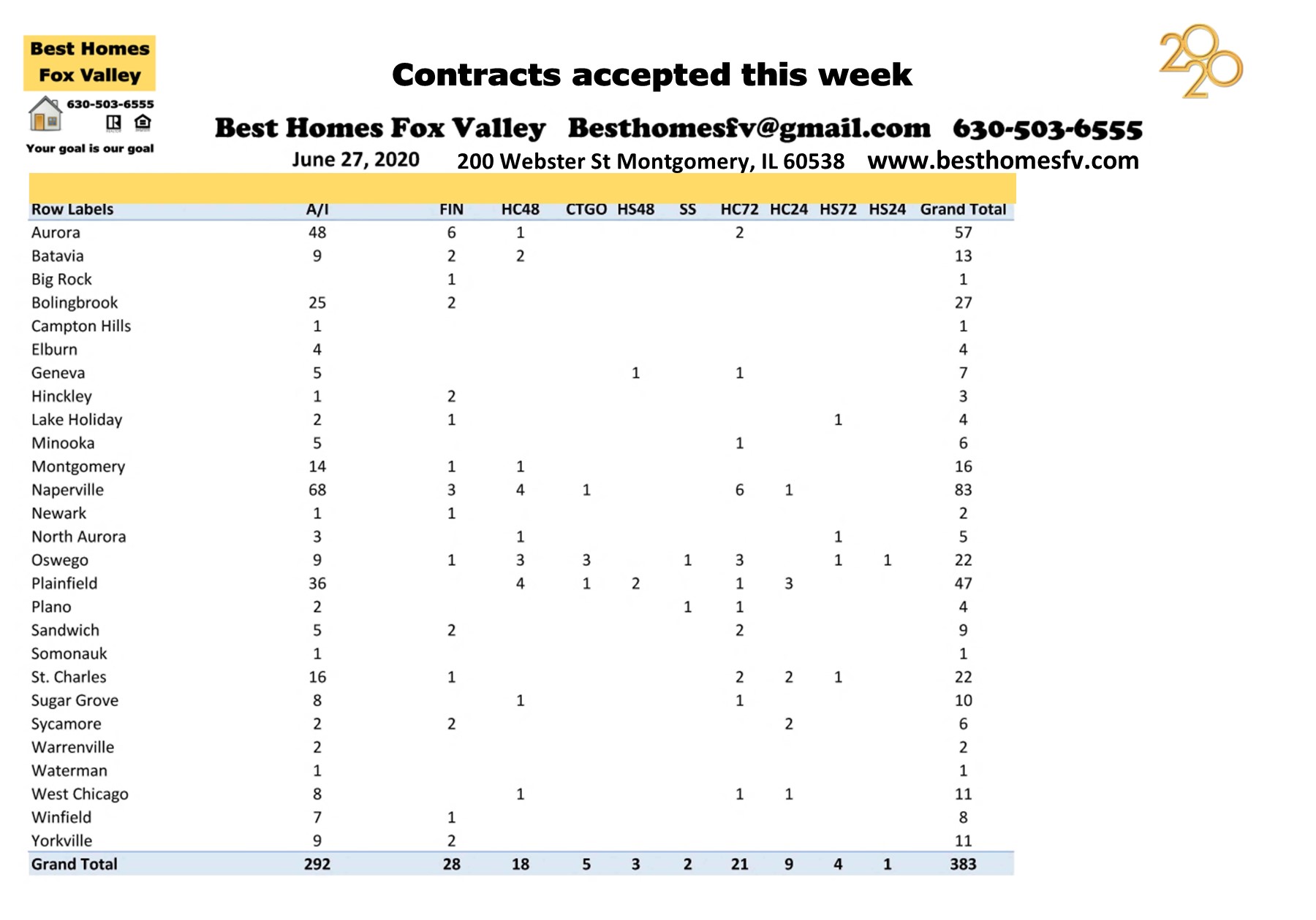 Market update Fox Valley week 26-Contracts accepted this weekContracts accepted on single family homes were down 4.49%.  383 accepted this week compared to 401 the week before.  More inventory will help to bring these numbers up.  There just is not enough homes for sale for the amount of buyers that are trying to find a home.  Interest rates are fantastic!