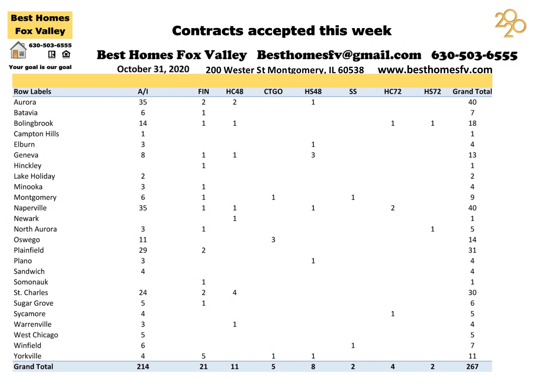 Market update Fox Valley week 44. New listings of single family homes this week are steady as she goes. 189 this week compared to 186 the week before. That is consistency! We don’t like consistency right now. There is not enough homes for the buyers that are looking. Multiple offers are the norm. Prices keep going up and are sometimes having a problem when the appraiser turns in their report.