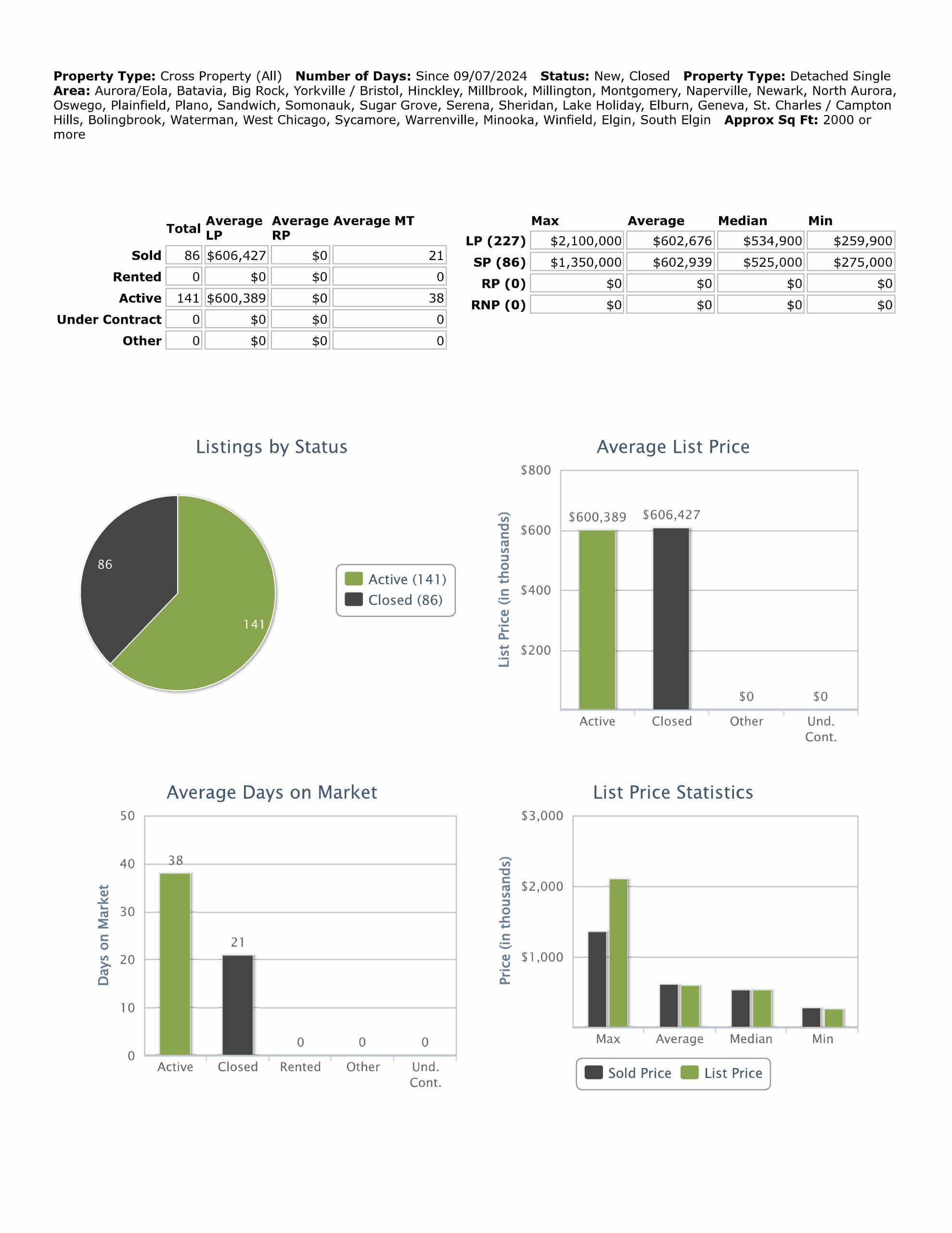 2,000 SF or more closed on 89 homes at median price $519,500 with 41 days average market time, last week 89 homes at median price $559,900 with 53 days average market time. Minimum price this week $317,000, last week $245,000.